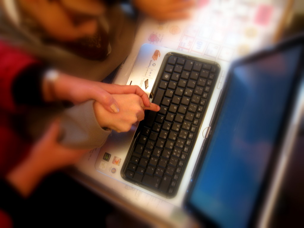 Cet atelier était organisé par l’association DPVE (Doigt qui Parle Voix Ecrite [1] ) qui vise à former des familles à cette technique pour communiquer avec leur proche porteur d’un lourd handicap (autisme, cérébro-lésion...). 5 personnes porteuses de handicaps étaient présentes, accompagnées d’un membre de leur famille. Après les présentations d’usage (sachant que la plupart des personnes se connaissent visiblement depuis un moment), l’animateur explique la règle. Chaque personne handicapée, le facilité, sera aidé par un valide, le facilitateur. Ce-jour là on n’échangera pas ou peu les binômes, et les échanges seront centrés autour d’images et de photos. Devant chaque facilité se trouve un ordinateur portable, le facilitateur prend la main du facilité et guide les doigts vers le clavier pour composer des mots. Pour "faciliter", il faut faire le vide dans ses pensées et se mettre à l’écoute de motions intérieures, ou de mots qui viennent. Quand on en tient un (ou une phrase) on commence à la taper. Par moment, la main du "facilité" refuse d’écrit certains mots qui ne viennent pas de lui, ou au contraire insiste pour continuer d’écrire alors qu’on pense ne plus avoir rien à dire.