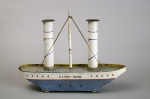 Comme toutes les expositions qui ont lieu au Musée de la Marine de Paris, celle sur les bateaux-jouets [1] est particulièrement soignée. Elle couvre l’âge d’or du jouet, l’époque où ce qui fut d’abord maquettes luxueuses et fidèles jusque dans des systèmes de propulsion fonctionnels destinées à un public connaisseur devint petit à petit une industrie. Il faut prévoir une heure et demie sans traîner, deux si on veut prendre le temps de savourer le plaisir de contempler de véritables merveilles.