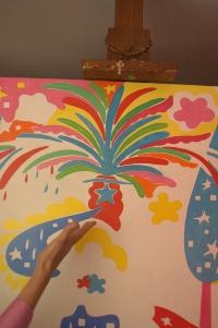 R : « Je ne peux pas le dire. De temps en temps, je m’aperçois qu’il y a une parenté entre un de mes motifs ou un de mes procédés et ceux de ces grands maîtres. Par exemple, je n’utilise que des couleurs franches, comme Matisse dans sa dernière période. Ce qui est certain, par contre, c’est que ce n’est sûrement pas un hasard si les peintres que j’aime sont pétris de Bible : Kandinsky a une approche des thèmes bibliques qui me touche, Mondrian était fils de pasteur et, lui aussi, imprégné de Bible.