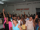Samedi, Le grand jour ! Nous résistons à la tentation d’aller faire du catamaran et rejoignons Trinité vers midi pour nous installer et faire la balance. Sur scène le son est plus que pourri, non seulement on a une demi-seconde d’écho mais en plus mon retour est près d’exploser et sature un maximum. Nous allons nous rafraîchir chez le cousin de Dom qui habite tout près pendant que les Enfants de la louanges font leur essais de sono et que Marius est au comble de l’angoisse. Il transpire, il tousse, il a les pieds qui gonflent, et en plus il a commencé un jeûne. On ne sait toujours pas si le concert va avoir lieu vu que le sonorisateur demande à être payé avant le concert, ni si nous réussirons à avoir un vidéoprojecteur pour projeter les paroles et faire chanter les gens. Il faut dire qu’avec des tickets à 20 euros, on comprend que ce ne soit pas facile à remplir et il faudra au moins 500 entrées pour que Marius ne mange pas sa chemise. Il n’y a que 270 places de prévendues.