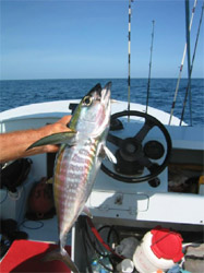 Jeudi, Rodolphe et moi nous échappons à Tartane et allons à la pèche au gros (un sport qui nous est bien destiné comme son nom l’indique) avec un ami du cousin de Dom (vous avez suivis ? C’est pas grave). Cet ami, Yves, est féru de pêche sportive. Tous les deux jours sur l’eau, il a même implanté des DCP, dispositifs de concentration de poissons : des objets flottants entre deux eaux, ancrés par 2500 mètres de fond, qui recréent un écosystème et attirent au final des gros poissons.