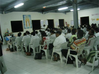 Il connaît tous les bons coins (1 heure de route en pleine mer pour s’arrêter au milieu de nulle part : « ici il y a des thons »), psychanalyse les oiseaux (« celui là il a vu un gros et il tourne autour »), propose un menu au fretin adapté à la journée (« ah on ne veut du bleu aujourd’hui ? on va essayer le rouge »). Nous revenons en fin de journée avec 2 thons, 2 barracudas et une feuille (énorme poisson plat) plus la joie de croiser des dauphins. Évidement nous sommes bien à la bourre pour le rendez vous du soir, d’autant que Rodolphe a pris soin de ranger les clefs dans le sable près du 4X4 d’Yves … Bref nous arrivons au groupe de prière de Ducos (oui comme la veille) bronzés mais avec une demi-heure de retard. Vincent et Michèle s’imaginaient déjà seuls pour animer cette prière de 2 heures devant 500 personnes … Là bas nous retrouvons Serpico à la batterie (nous l’avions rencontré à Morne des Esses) , le jeune Benjamin au piano. Et s’engage une belle soirée de louange et de prière complétée par un prêche dynamique du Père Marcel. Celui ci (que j’avais d’ailleurs aperçu le matin même à la messe à Ste Lucie) fait hurler de rire son auditoire et mêle français et expressions créoles. Dieu visite son peuple. Beaucoup de grâces et je me réjouis encore un fois de pouvoir faire la connaissance de ces véritables frères et sœurs.