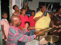 Mercredi, ayant appris que les messes quotidiennes sont en général vers 6h dans les paroisses, je me pointe à cette heure à l’église de Sainte Luce. Facile de se lever avec le décalage horaire qui nous réveille vers 5 heure. La messe est en fait à 6h30 mais il y a déjà une 10aine de personnes à prier dans l’église. A la demie, une 15aine d’autres personnes nous ont rejoins et la cérémonie commence par 20 minutes de Laudes. Quand je vous dit que c’est un peuple spirituel ! Le reste de la journée sera principalement occupée par une répétition avec le batteur (Olivier) et le bassiste (Jean-François) qui nous accompagneront samedi. Ils font parti du groupe de musique des « Enfants de la louange » qui fera notre première partie samedi, tout comme Jean-Luc et Line, piliers du groupe de prière de Morne des Esse, qui nous accueillent chez eux pour cette répétition. Celle-ci est un peu difficile car nous sommes fatigués, la mise en place est très approximative, mais nous ne pouvons pas travailler beaucoup car il nous faut garder de l’énergie pour les deux interventions de ce soir. Cette fois-ci nous prenons les devant pour ne pas être obligés de nous séparer comme hier soir : nous ne resterons qu’une heure au premier et arriverons une heure en retard au second. De toute façon, il était impossible de faire le premier à 18h et d’enchaîner le 2e à 19h puisqu’il y a 45 minutes de routes entre les deux. Les Martinicais nous édifient une nouvelle fois : les Enfants de la louange ont entamés un jeûne de 3 jours pour porter le concert du samedi. Résultat nous mangeons sans eux …